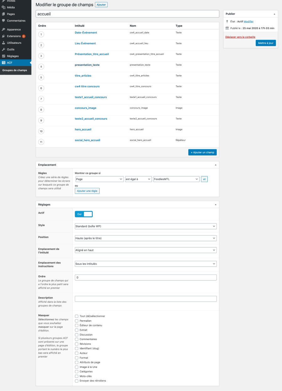Puis, il faut Faire les ACF. Pour cela il faut installer l’extension Advanced Custom Field PRO. Puis utiliser les options pour répartir les ACF entre les pages et le footer.