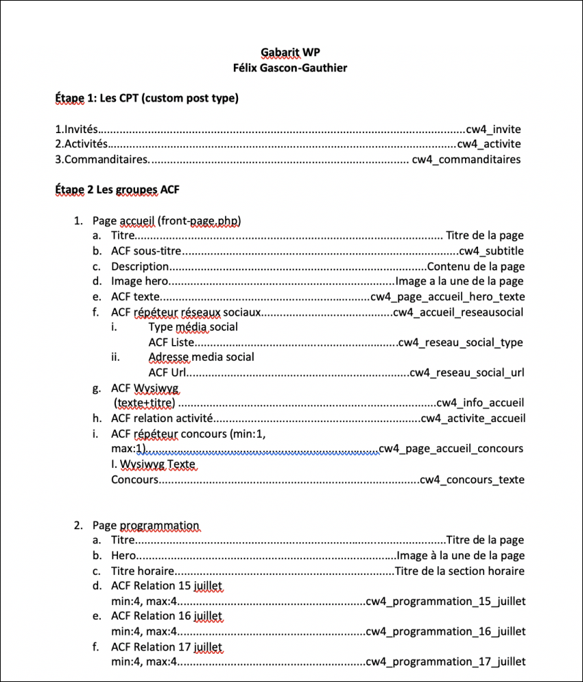 Avant de commencer les maquettes HTML/CSS, j’ai utilisé le design préalable pour déterminer les Custom Post Type(CPT) et les ACF(Advanced Custom Field). Ainsi lors du travail wordpress, je saurais quelles catégories créer et les types des contenus à rendre modifiable.