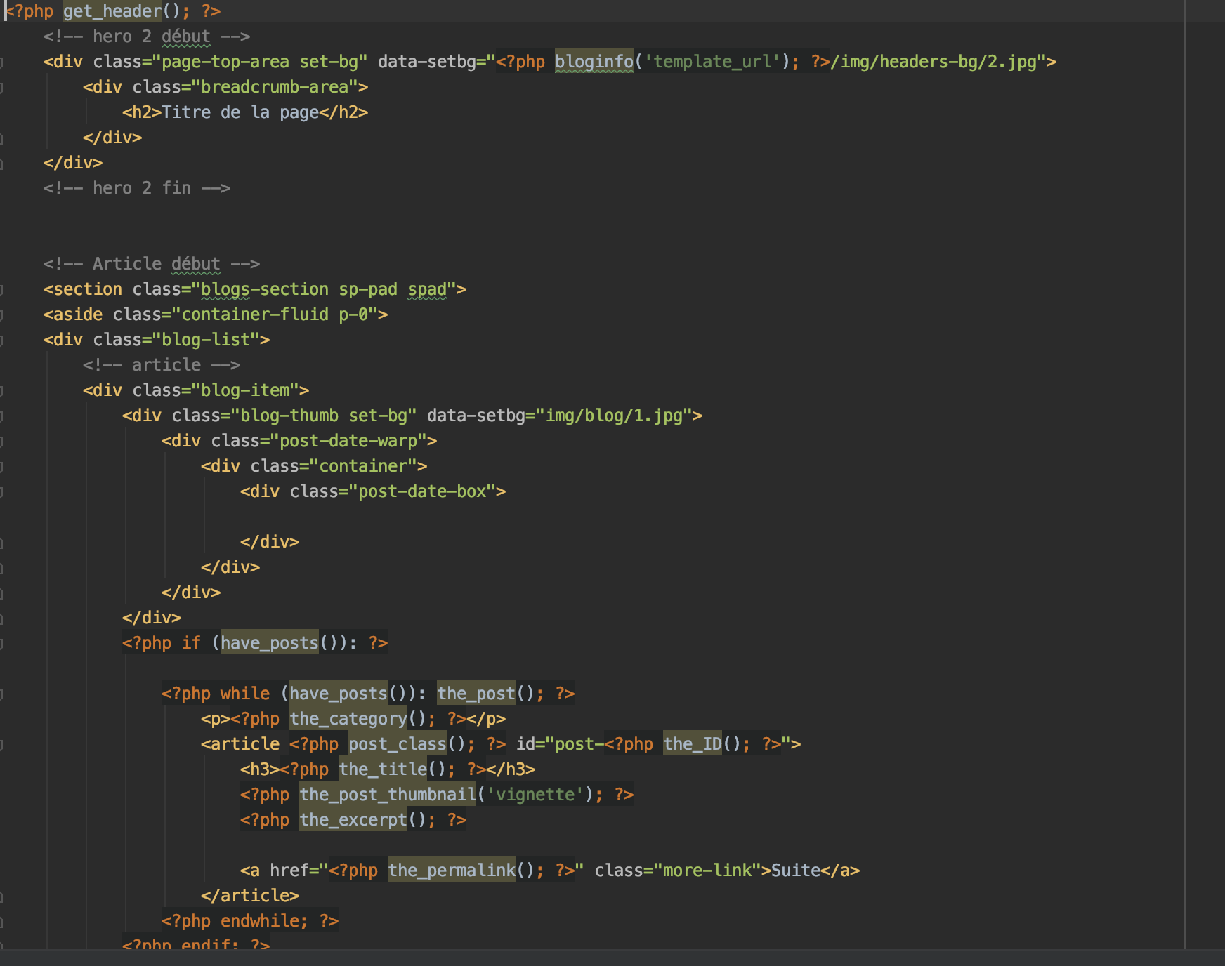 Puis j'ai mis dans les gabarits d'articles et dans la page blog le code pour afficher les articles réalisés dans un précédent travail.