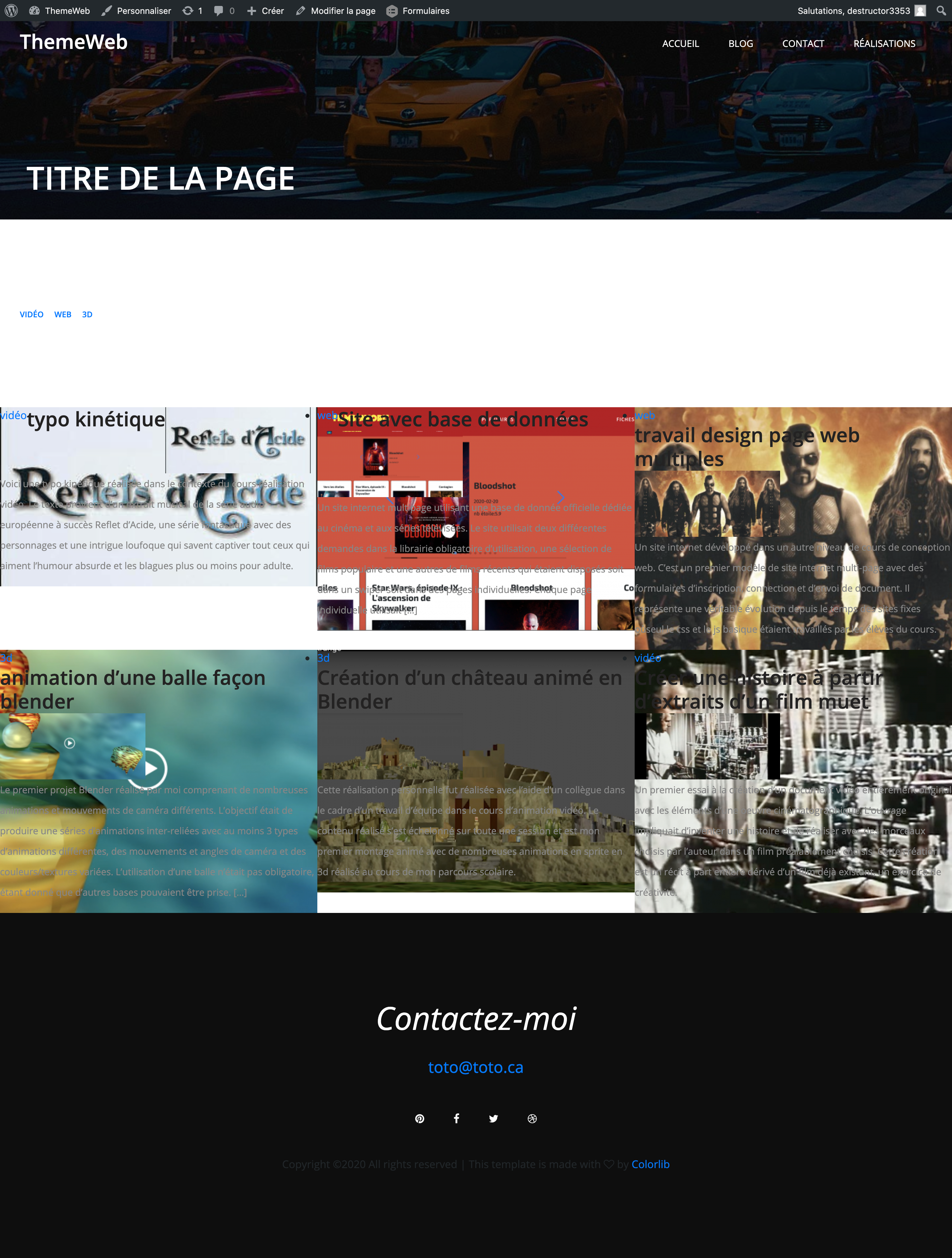 Création d'un thème Worpress en utilisant des maquettes fournies et des articles/éléments créés par soit et intégrés dans les pages.