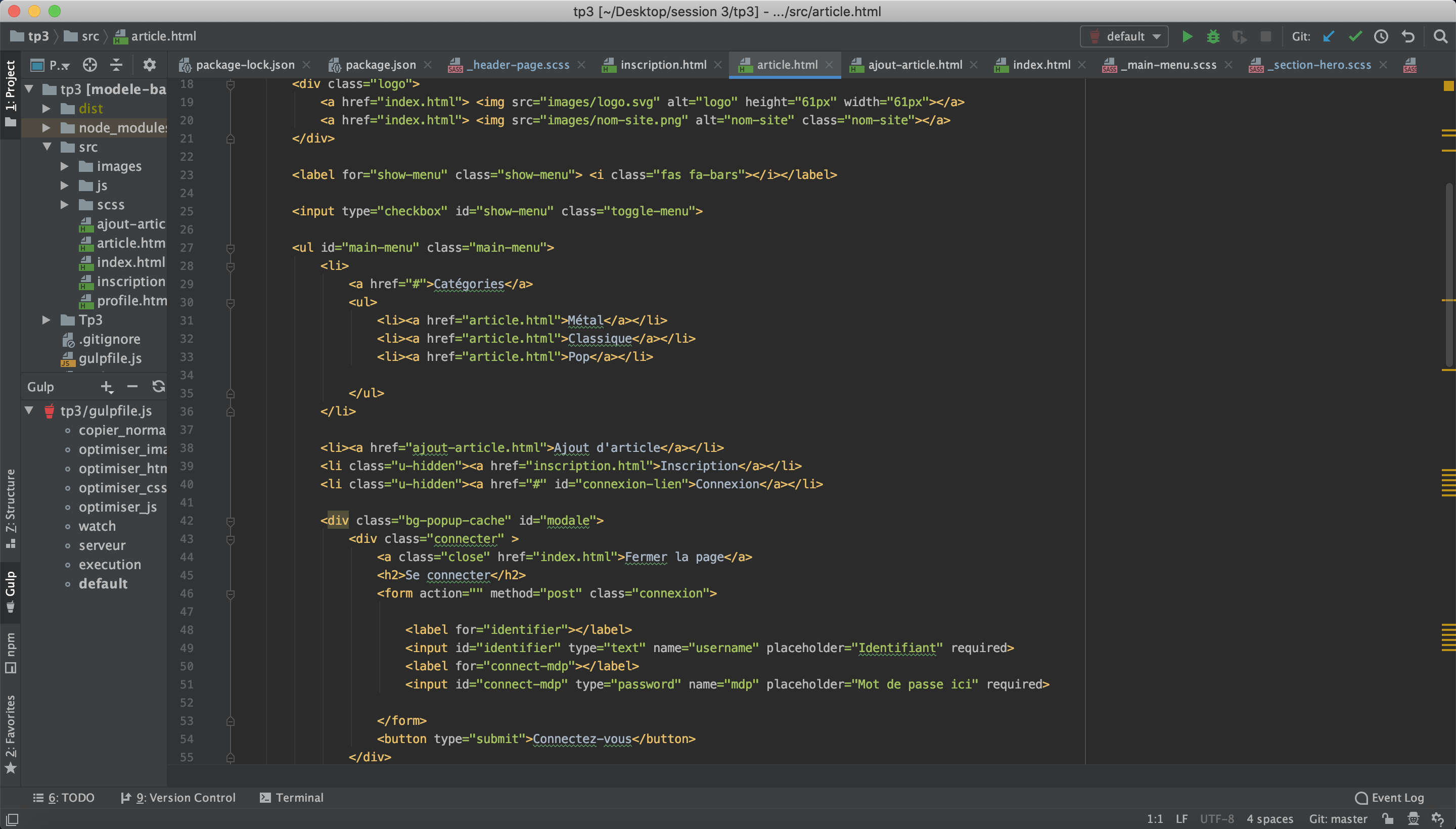 Création des pages, formulaires et contenus sur webstorm